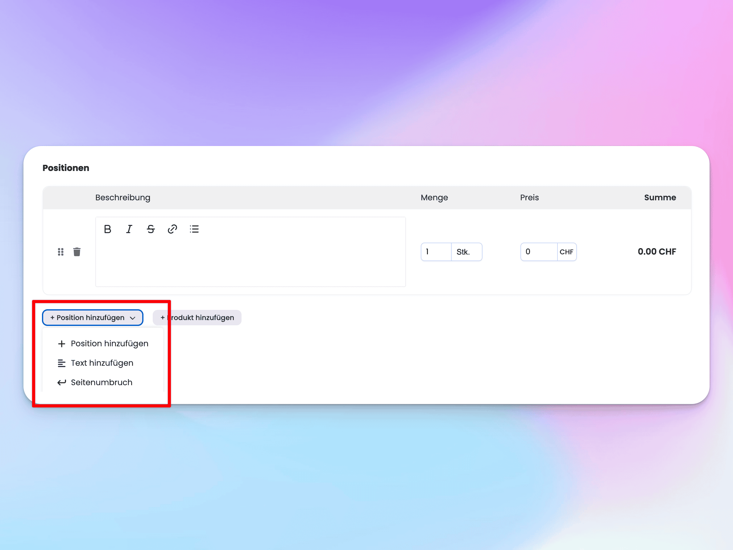 Ausserdem gibt es auch bei den Positionen von Offerten und Rechnungen ein Update. Du kannst neu
